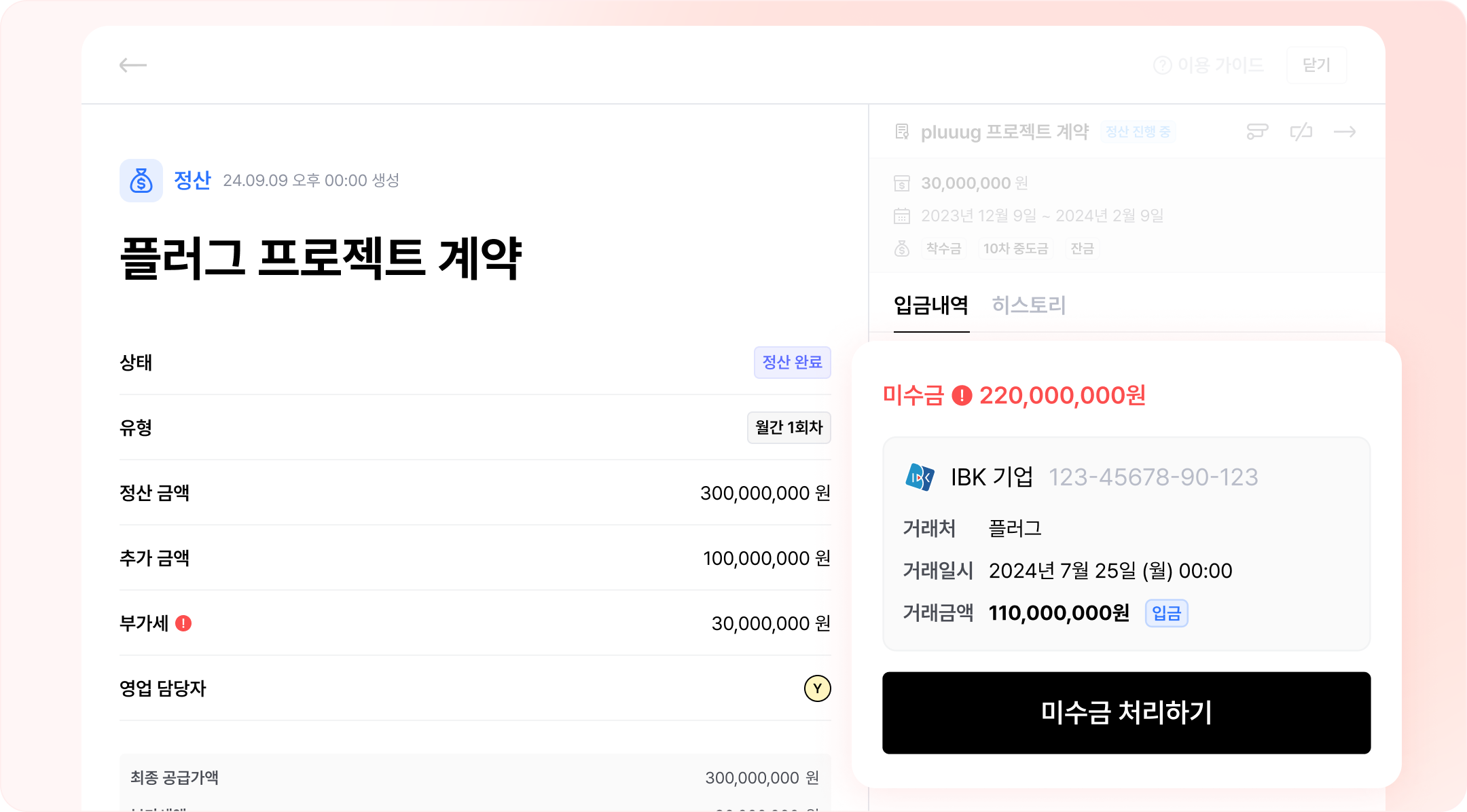 정산이 예정된 금액이 100% 입금되지 않고, 나누어 들어온 적이 많으신가요? 이제 입금 내역을 연결하면, 자동으로 미수금이 표시되고 해당 정산에서 바로 미수금을 생성할 수 있어요.