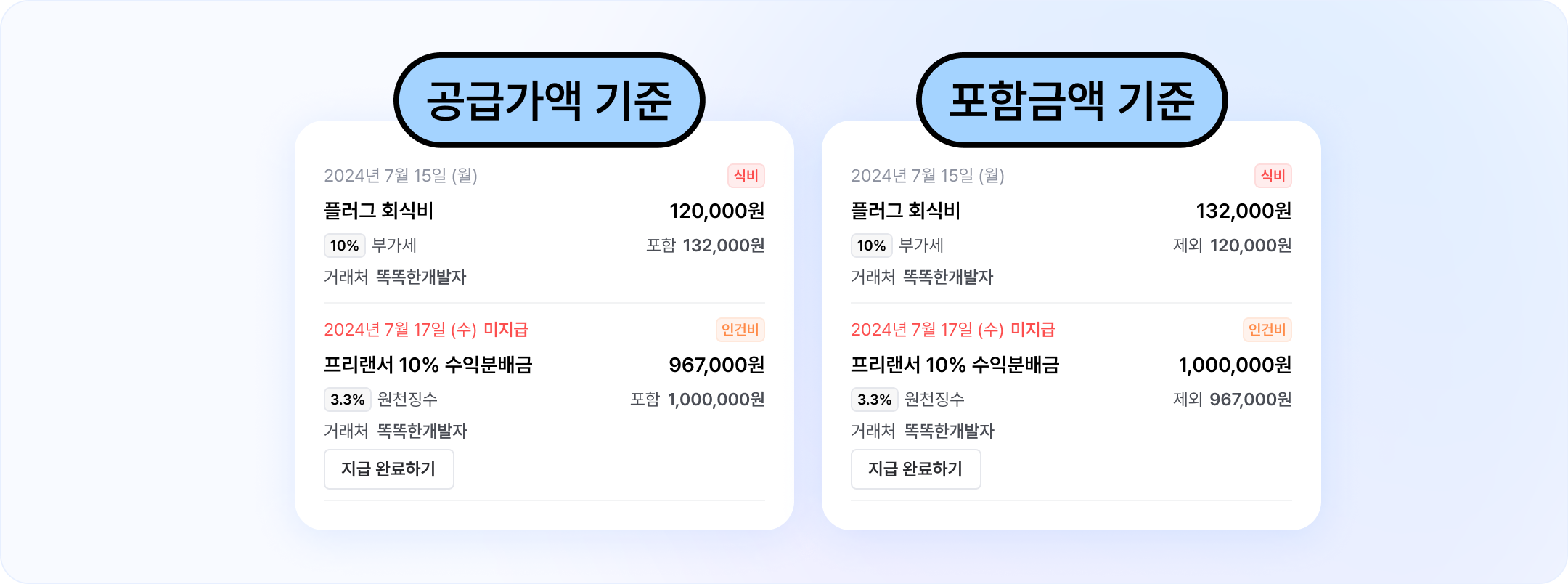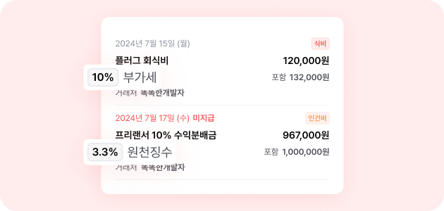 기존 지출내역 관리에 추가 정보를 관리할 수 있도록 업데이트 됐어요. 1. 세율 (부가세10%, 원천징수3.3%, 없음) 2. 거래처 3. 결제수단 (계좌이체/카드결제/현금/기타) [공급가액]을 기준으로 할 경우, 리스트에서 세금을 포함한 금액을 볼 수 있고, [포함 금액]을 기준으로 관리할 경우, 부가세를 제외한 금액이 나타나도록 업데이트됐어요.