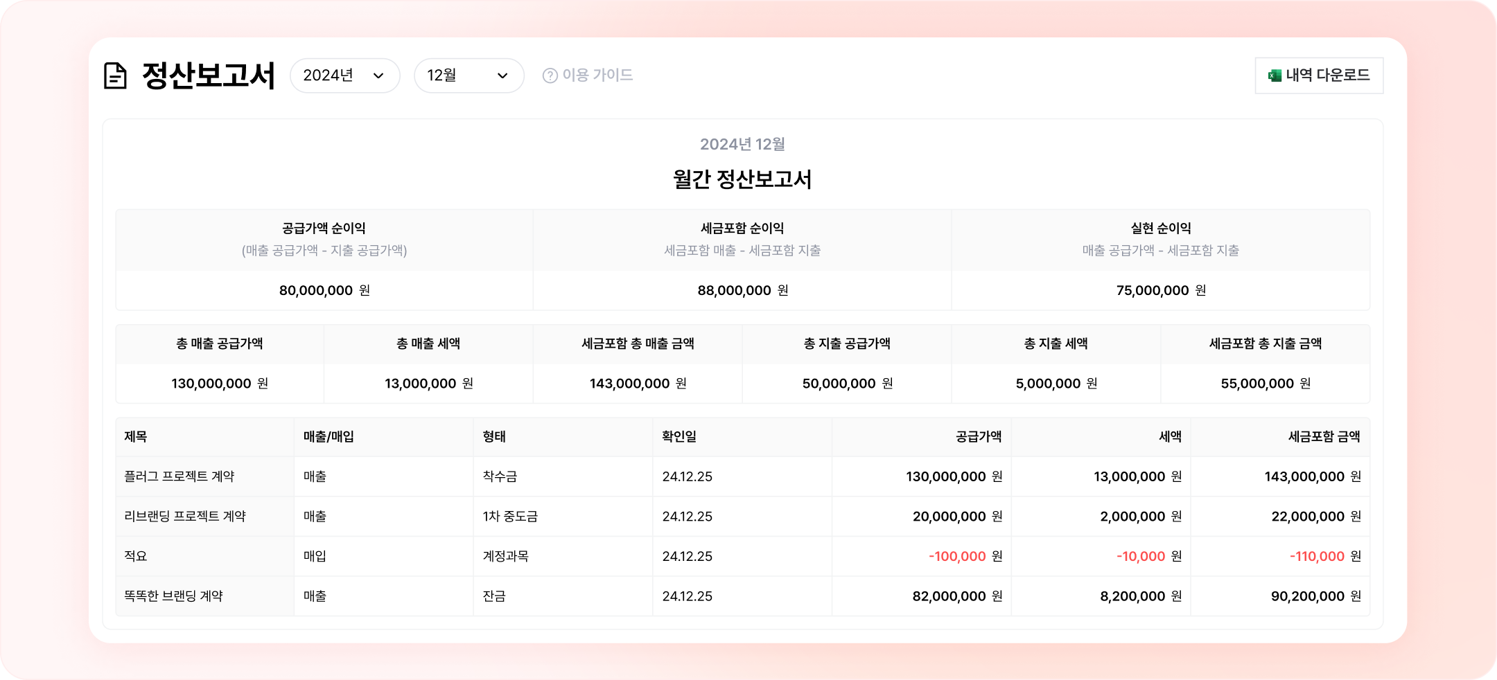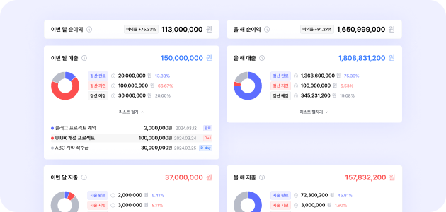 매출 정산내역만을 볼 수 있었던 정산보고서에 지출내역, 세액, 순이익 인사이트가 추가됐어요.