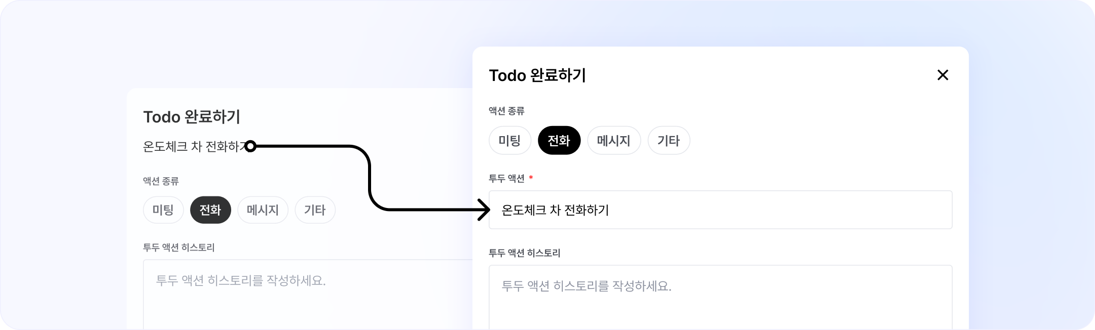 영업 Todo를 완료할 때, 수정할 수 없었던 투두 액션 내용을 완료할 때에도 수정할 수 있도록 변경됐어요.