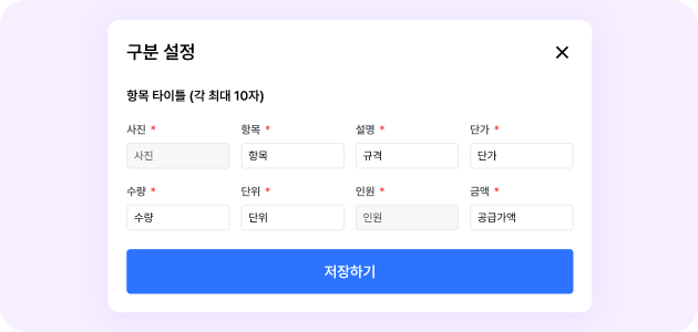 견적서 항목 상단의 타이틀을 커스텀할 수 있는 기능이 추가됐어요. 추가로, 항목에서 마이너스 금액을 입력하여 임의로 금액을 절사하거나 할인할 수 있도록 업데이트 되었어요.