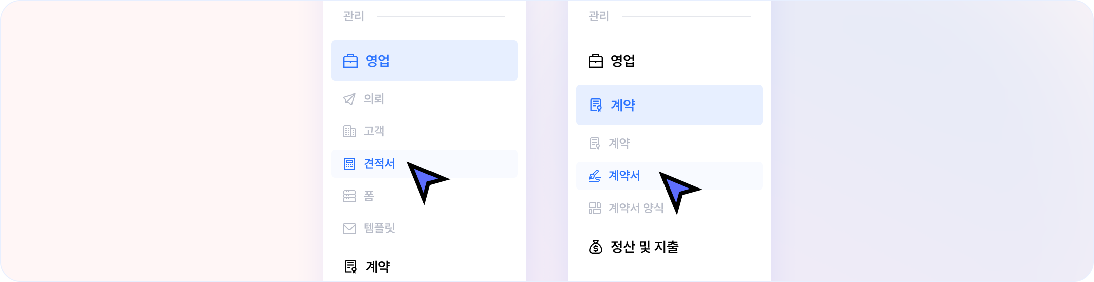 의뢰 페이지 내에서 편집하는 '견적서'와 계약 페이지 내에서 편집하는 '계약서' 항목들을 어떤 건인지 관계 없이, 하나의 메뉴에서 모아 볼 수 있는 기능이 추가됐어요.
