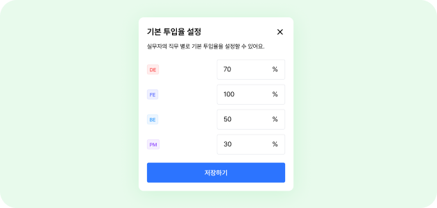 리소스를 투입할 시, 각 직무에따라 기본 투입율%가 바로 적용될 수 있도록 기본 투입율 설정 기능이 추가됐어요. 기존에 10%단위로 선택할 수 있었던 투입율 선택부가 직접입력으로 변경되었어요.
