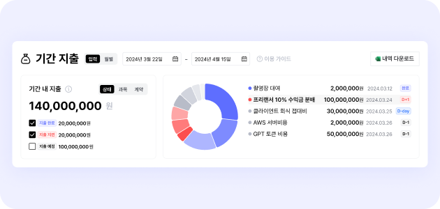 기존 지출 대시보드를 기간 매출 대시보드와 유사한 형태로 변경하여, 커스텀 기간의 정확한 금액 인사이트를 확인할 수 있도록 개선됐어요.